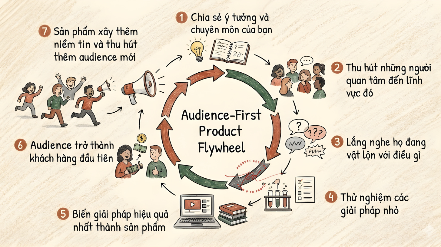 Bạn chia sẻ ý tưởng và chuyên môn của mình → bạn thu hút những người quan tâm đến lĩnh vực đó → bạn lắng nghe họ đang vật lộn với điều gì → bạn thử nghiệm các giải pháp nhỏ → bạn biến giải pháp hiệu quả nhất thành sản phẩm → audience trở thành khách hàng đầu tiên → sản phẩm xây thêm niềm tin và thu hút thêm audience mới → vòng lặp bắt đầu lại.