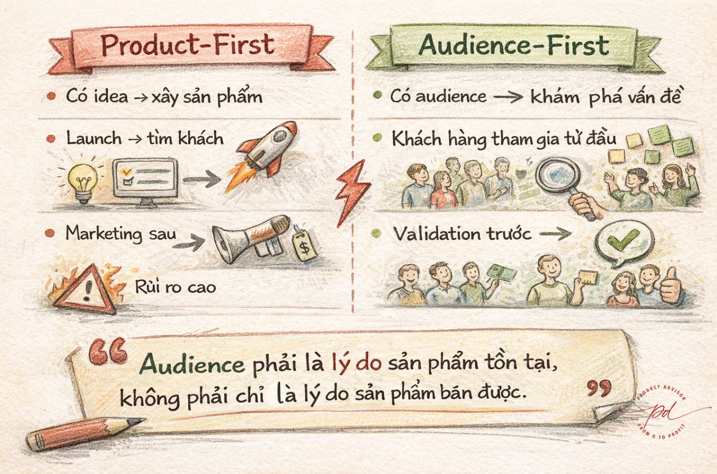 Marketing là thứ bạn làm sau khi có sản phẩm. Audience-first là thứ bạn làm trước khi có sản phẩm, và nó ảnh hưởng đến mọi quyết định trong quá trình xây dựng, từ chủ đề bạn chọn, vấn đề bạn giải quyết, cách bạn đặt tên cho sản phẩm, đến cách bạn thiết kế trải nghiệm học tập.