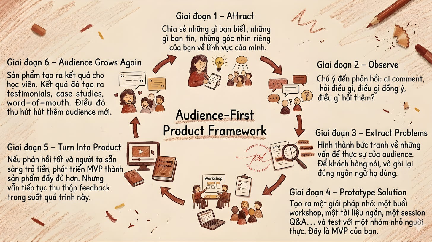 Con đường thứ hai (ít người đi hơn nhưng hiệu quả hơn nhiều) là: bạn dùng audience như một không gian để lắng nghe, học hỏi, thử nghiệm, và cùng nhau tìm ra vấn đề thực sự cần giải quyết. Sản phẩm là kết quả của cuộc trò chuyện đó, không phải thứ bạn đã có sẵn trong đầu từ trước.