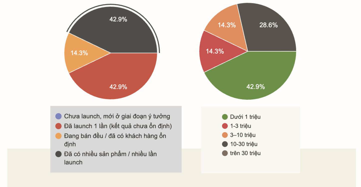 Bên cạnh đó, 57.2% đang bán sản phẩm ở mức giá dưới 3 triệu, và điều này cũng sẽ lý giải một phần lý do cho trạng thái tinh thần burnout của họ khi không có đủ nguồn lực để cải thiện sản phẩm, trải nghiệm, marketing.