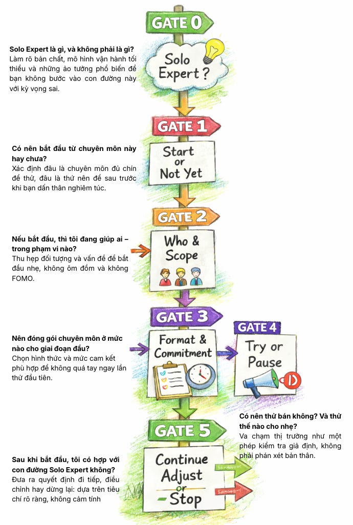 Con đường trở thành solo expert thường bắt đầu từ chữ “expert”, và chính vì thế nó có thể vô tình trói buộc bạn vào cảm giác phải đủ giỏi, phải được công nhận, phải có bằng cấp hay chứng chỉ gì đó trước khi dám tự nhận là chuyên gia.