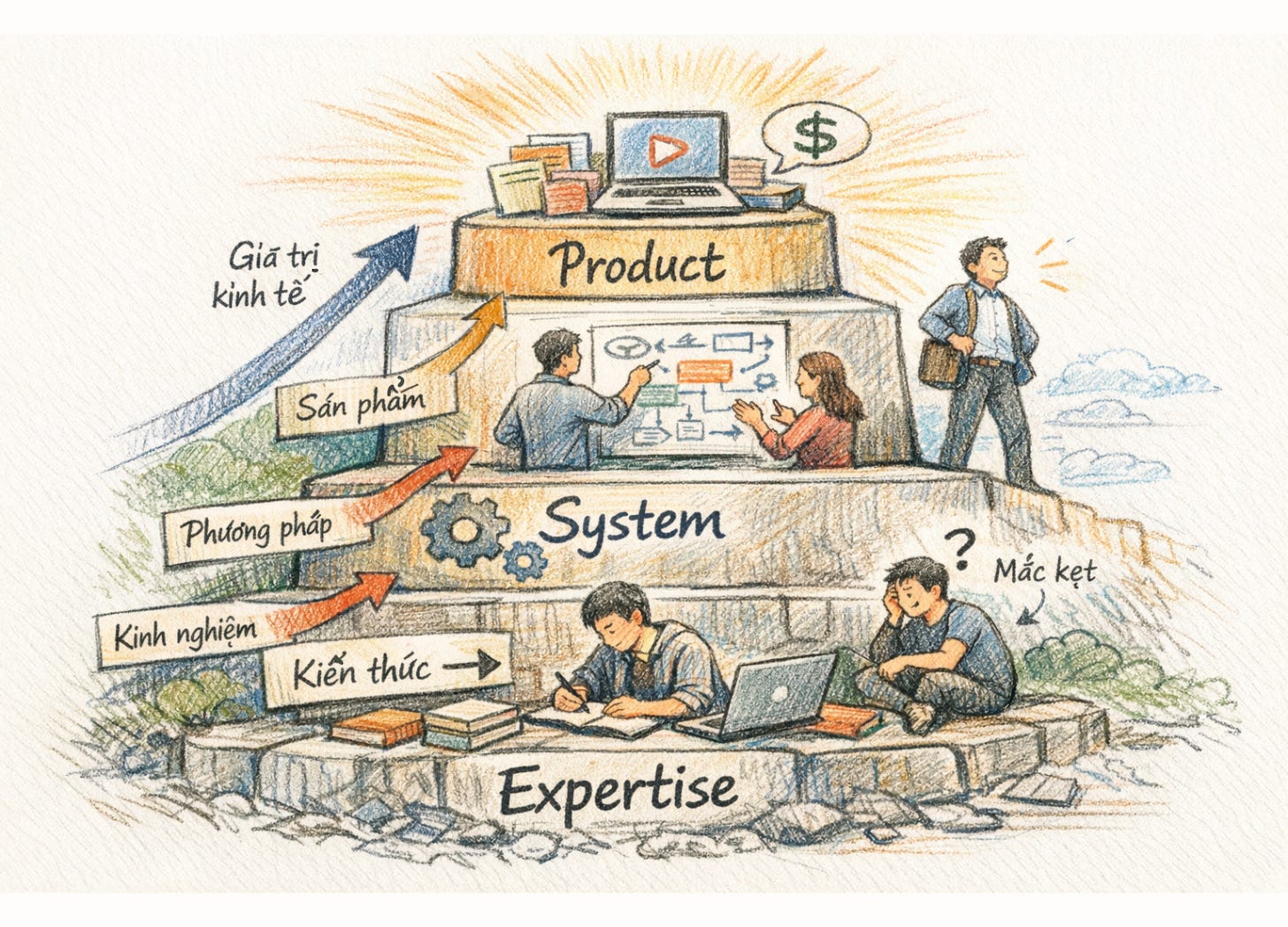 Phần lớn chúng ta mắc kẹt ở tầng một, sở hữu expertise nhưng không bao giờ di chuyển lên tầng hai và ba. Và chính ở hai tầng đó, giá trị kinh tế mới thực sự được tạo ra