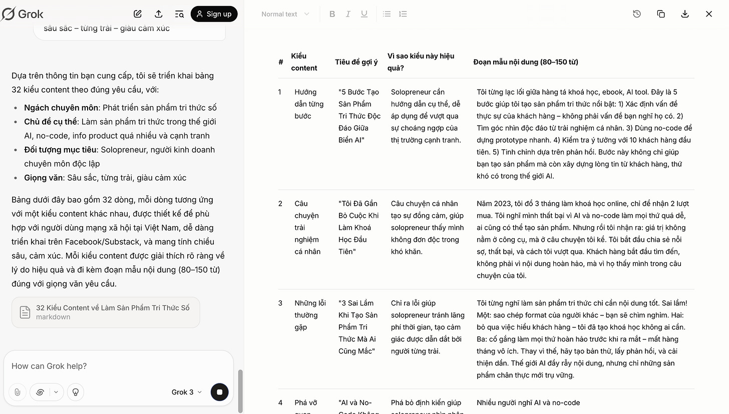 Mình đã thử và thấy hoạt động rất hiệu quả. Đây là một ví dụ mà mình sử dụng AI Mega prompt này trên Grok thì ra ngay 1 bảng với 32 kiểu viết như ảnh dưới. Bạn chỉ cần copy AI Prompt mình đã biên soạn, dán vào AI bất kỳ bạn thường sử dụng như GPT, Grok, DeepSeek và chờ kết quả nhé.