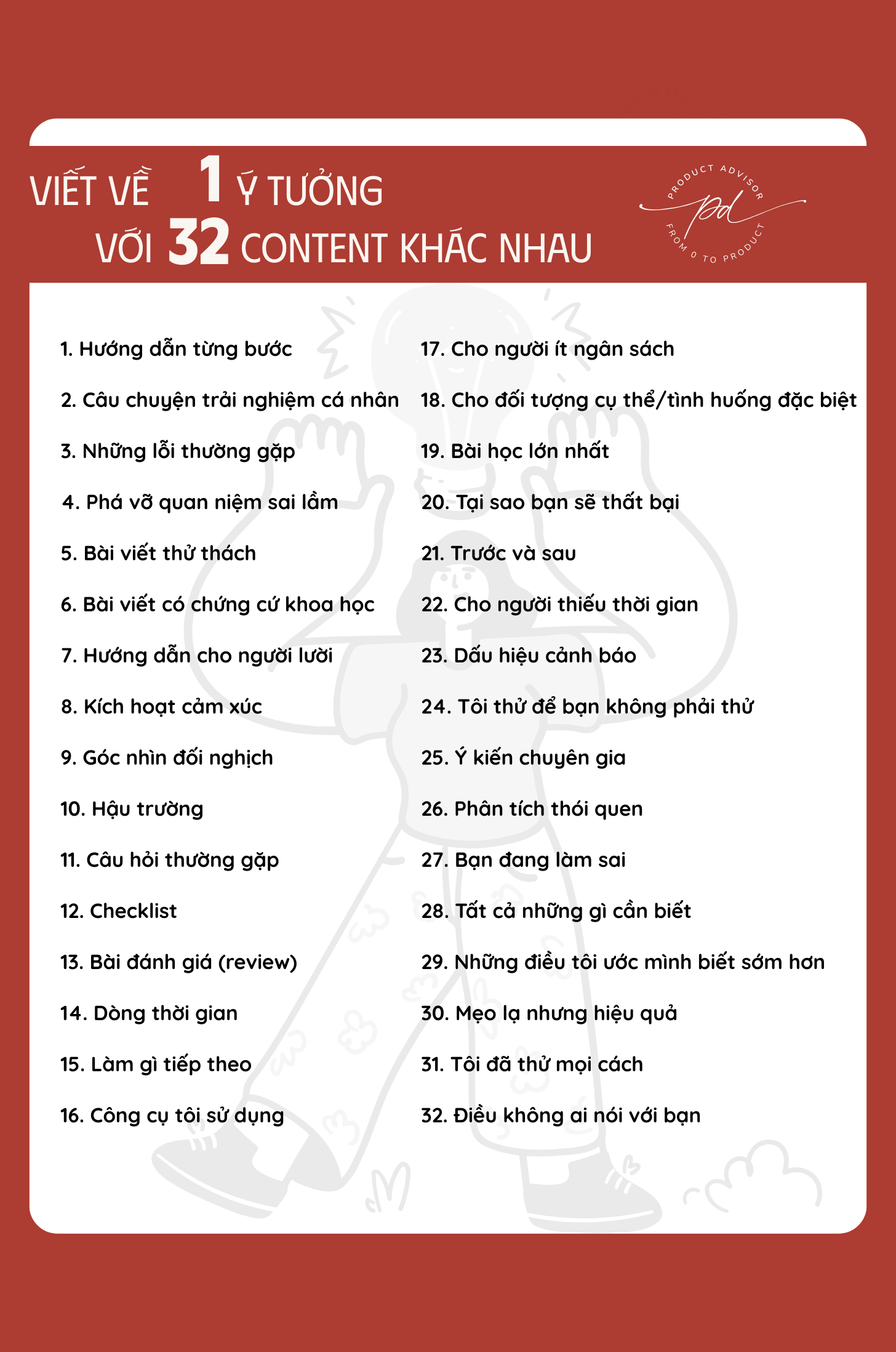 Từ đó, mình không còn sợ việc lặp lại. Mình chỉ tập trung vào việc làm mới. Và đây là 32 cách làm mới nội dung mà chỉ xoay quanh 1 ý tưởng. Cuối bài viết này, mình sẽ tặng bạn 1 AI Mega Promt để bạn tự triển khai chuỗi bài viết cho mình theo 32 cách đi từ 1 ý tưởng/1 vấn đề cụ thể.