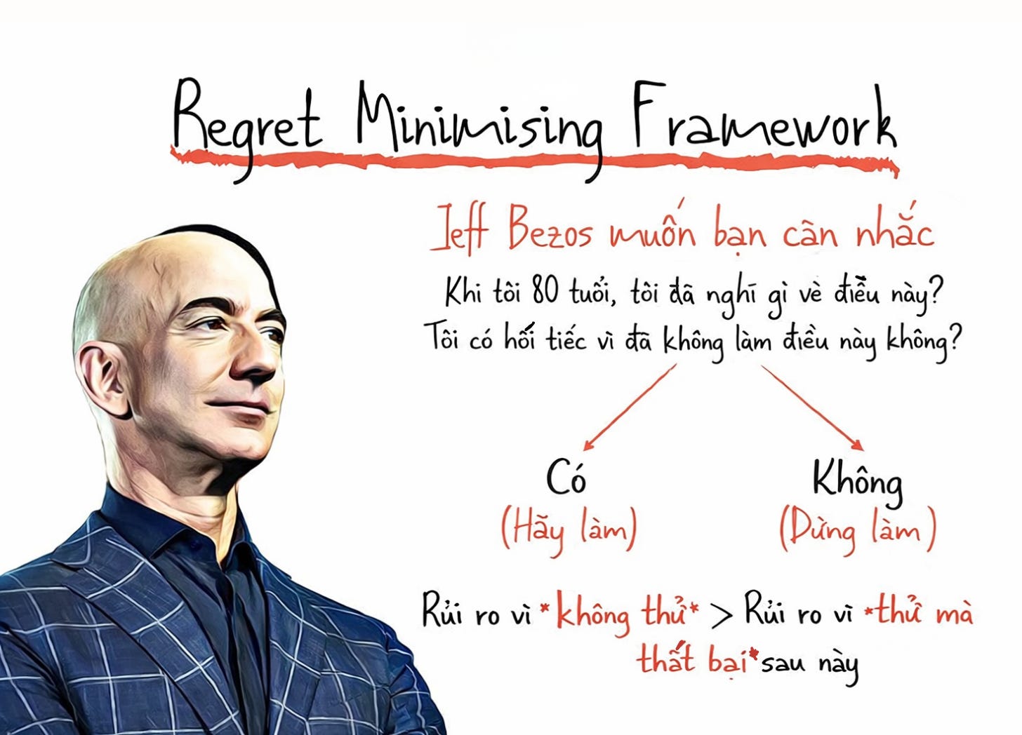 Dung từng xem 1 video của Jeff Bezos - ông chủ của Amazon, trong đó chia sẻ một khung ra quyết định rất nổi tiếng (cũng chính là thứ đẩy đến sự hình thành cảu Amazon về sau), đó là Regret Minimization Framework.