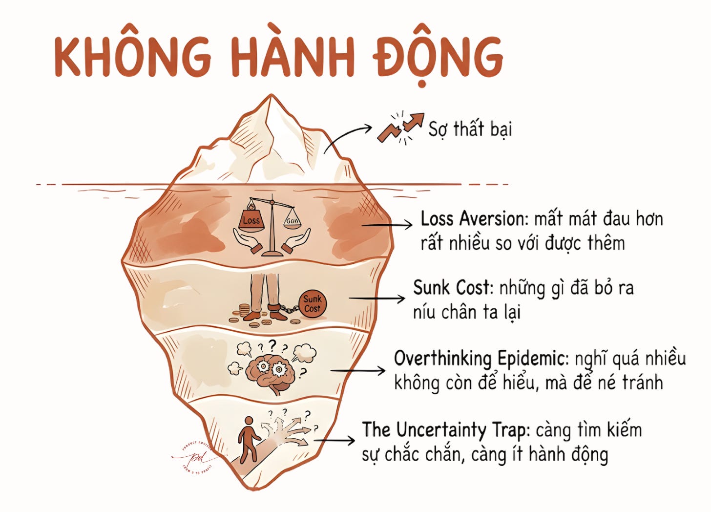 Nhưng trớ trêu thay, “sẵn sàng” trở thành một điều kiện không bao giờ đạt được. Vì mỗi lần bạn hiểu thêm một chút, bạn lại nhìn thấy thêm nhiều rủi ro hơn trước. Overthinking, ở tầng sâu nhất, không phải là vấn đề tư duy mà là phản xạ phòng vệ. Một cách để não nói rằng: “Nếu mình không hành động, mình cũng không thể thất bại.” Và The Uncertainty Trap chính là nơi rất nhiều người thông minh mắc kẹt: